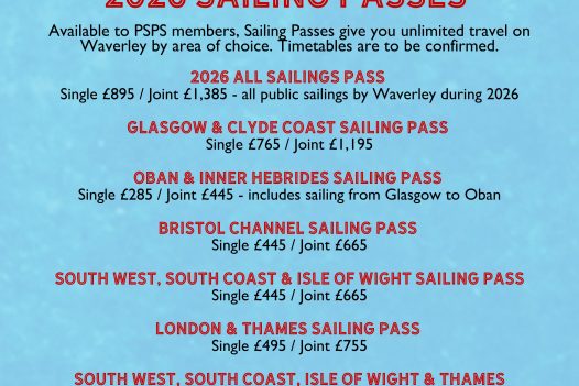 Go Anywhere Vouchers and Annual Sailing Passes are available to members of the Paddle Steamer Preservation Society (PSPS).